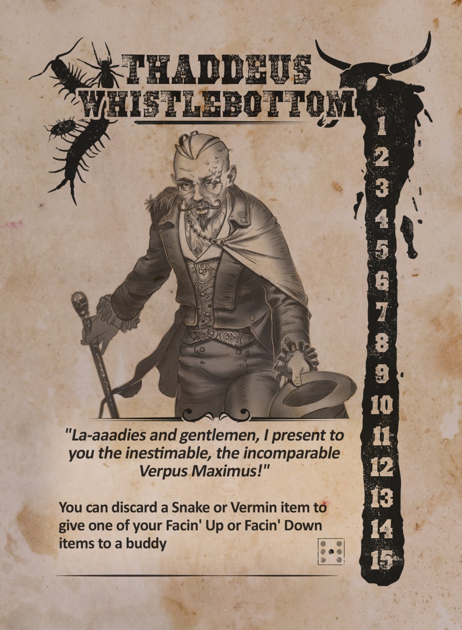 Thaddeus’s Badass action lets him put these talents to good use. The action is a lot like Zach McBride’s Badass action, which let’s Zach give a buddy one of his Facin’ Up items. Thaddeus, however, can give a buddy one of his Facin’ Up OR Facin’ Down items, and all he’s got to do is discard a Snake or Vermin to do it.