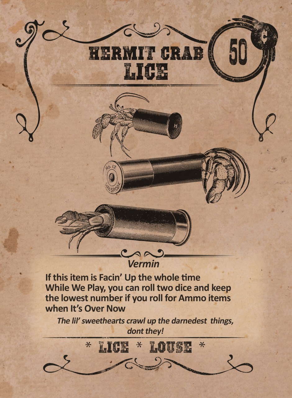 The discard requirement might seem stiff, but Buzzards have lots of Snake and Vermin items, like the cute, cuddly, and most importantly CHEAP Hermit Crab Lice, which also happen to helpfully be a Geegaw, too! With Hermit Crab Lice, you’ve got a painfully cheap and easily discardable Vermin item that doesn’t even take up one of your Facin’ Up item slots.